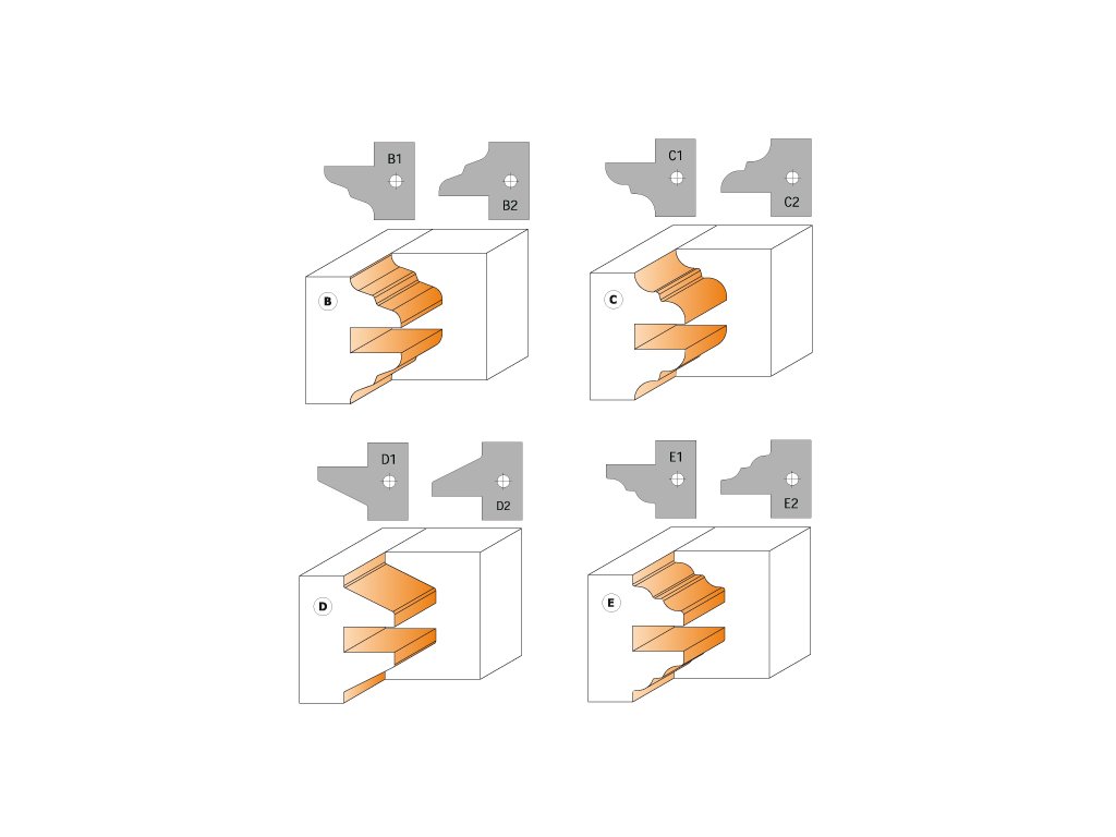 Tento nástroj je určen k výrobě interiérových dveří z měkkého a tvrdého dřeva. Frézovací hlava je velice všestranná, neboť do ní lze upnout pět různých profilových žiletek, s nimiž vyrobíte nejžádanější profily. Stavitelnou drážkovací frézu, která je také součástí sestavy, lze použít samostatně k frézování drážek o tloušťce 8 až 15 mm. S touto jedinečnou CMT frézou vyrobíte profil rámu pro výplně i pro sklo. Určeno k použití se spodní frézkou. Výborně se hodí pro tvrdé a měkké dřevo o maximální tloušťce 48 mm.