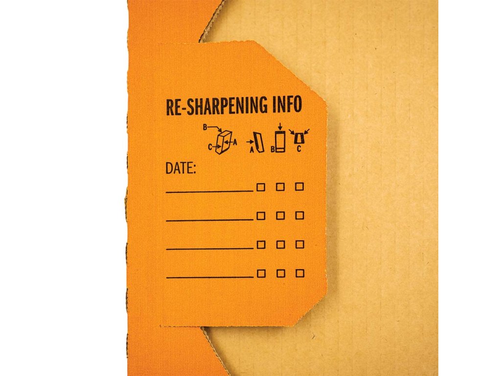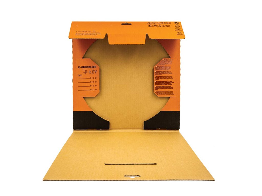 CMT oranžový ochranný obal na pilové kotouče. Pro kotouče do průměru maximálně 300 mm. Vyrobeno z pevného kartonu. Informace o provedeném ostření si můžete poznamenat do tabulky uvnitř obalu.