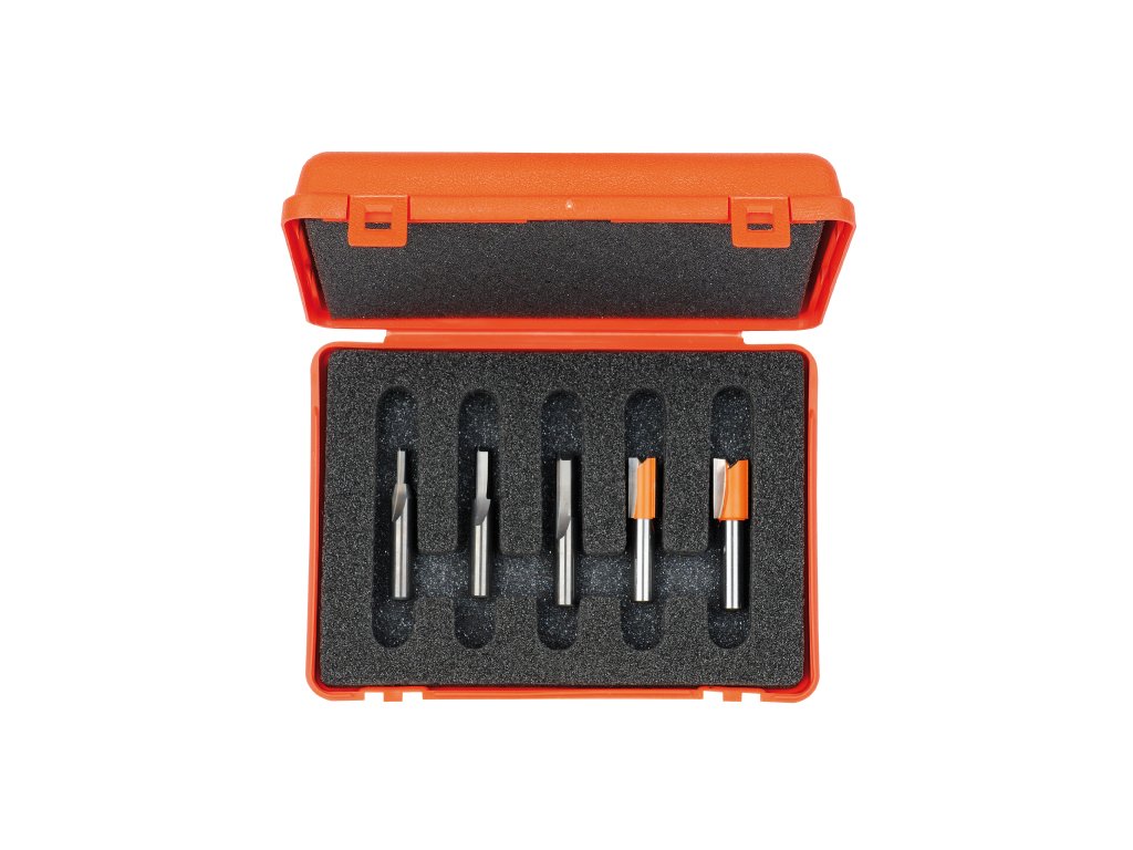 Ekonomicky výhodné sestavy fréz po 5 ks. Ideální pro zkušené řemeslníky a profesionály. Tvrdokovové břity HM, teflonový oranžový nepřilnavý potah, precizně naostřené břity.