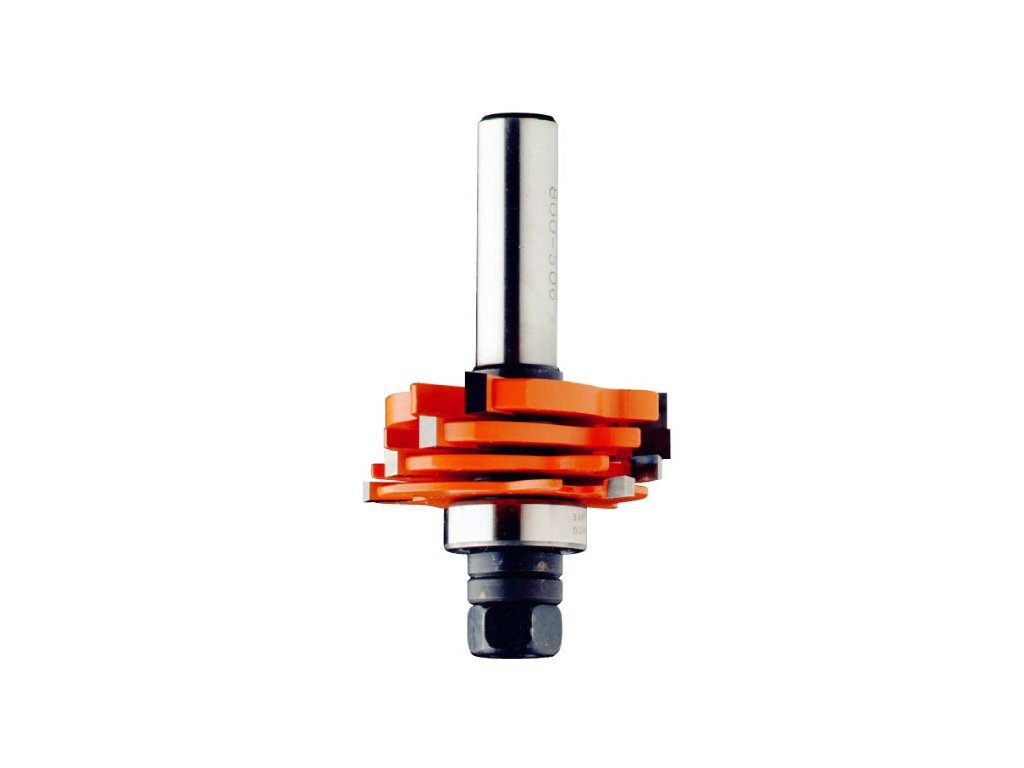 HM tvrdokovové řezné hrany fréz se nesmí nikdy dotýkat. Používejte podložky podle obrázku. Používejte pouze podložky dodané v sadě. Zkontrolujte, zda jsou všechny frézy namontované ve správném směru otáčení. Podívejte se pod upínací trn, zda se frézy budou otáčet ve směru hodinových ručiček.