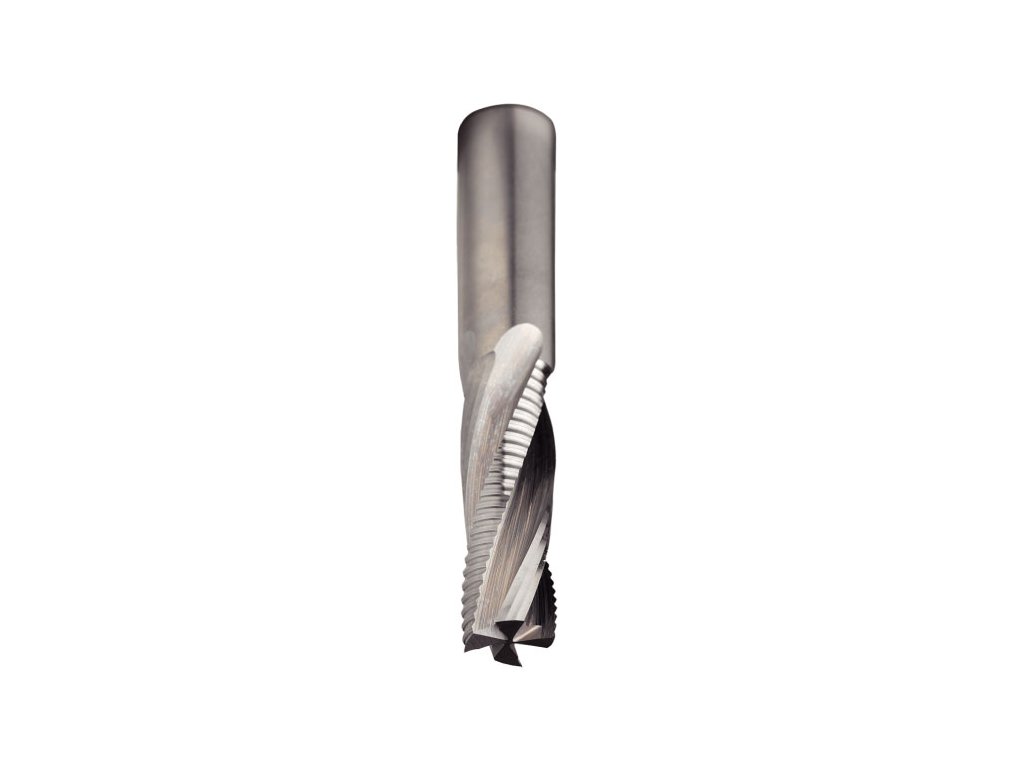 Speciální 4-spirálový design ostří. 2 hrubovací a 2 dokončovací spirály dávají mimořádně čistou hranu řezu při použití vysokých posuvů.
