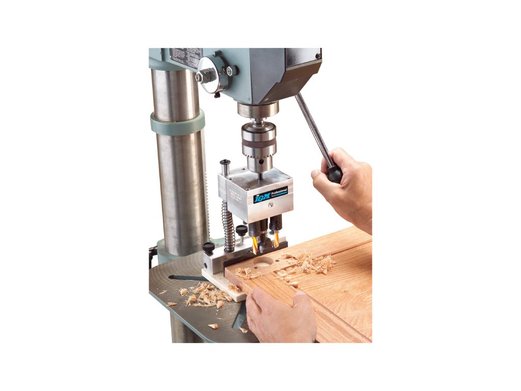 Revoluční vrtací přípravek se skládá ze stojanu a 8 typů vrtacích hlav, které lze na stojan namontovat. Můžete tak vrtak otvory pro závěsy Hettich, Blum, Mepla, Grass, FGV, pro malé závěsy 26mm, pro okenní kliky nebo použít hlavu s 5 vřeteny s roztečí 32mm pro vrtání děr pro kolíky či nosiče polic. Použití s ruční vrtačkou nebo na stojanových vrtačkách. Pro mazání použijte olej Mobil SHC100.