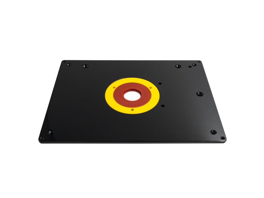 Středová frézovací deska je bez otvorů pro upnutí horní frézky a je vyrobena z 6 mm hladkého plastu v černé barvě. Je vybavena 4-mi vyrovnávacími šrouby pro ustavení do roviny s pracovní deskou frézovacího stolku. Dodávaná se 2-mi odjímatelnými středovými kroužky pro upnutí různých velikostí stopkových fréz o průměru do 30 mm, do 66 mm. Maximální středový otvor desky je 98 mm. Pomocí přiloženého kopírovacího kolíku můžete volně frézovat jakékoliv tvary. Rozměry středové desky jsou 306 mm x 229 x 6 mm.