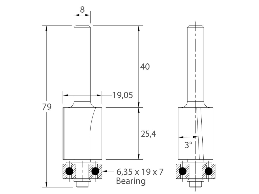 Díky šikmým zubům mají tyto frézy nižší odpor a vyšší kvalitu řezu oproti rovným zubům. Pro frézování podle šablony lze vložit kopírovací ložisko i na stopku (s omezovacím kroužkem).