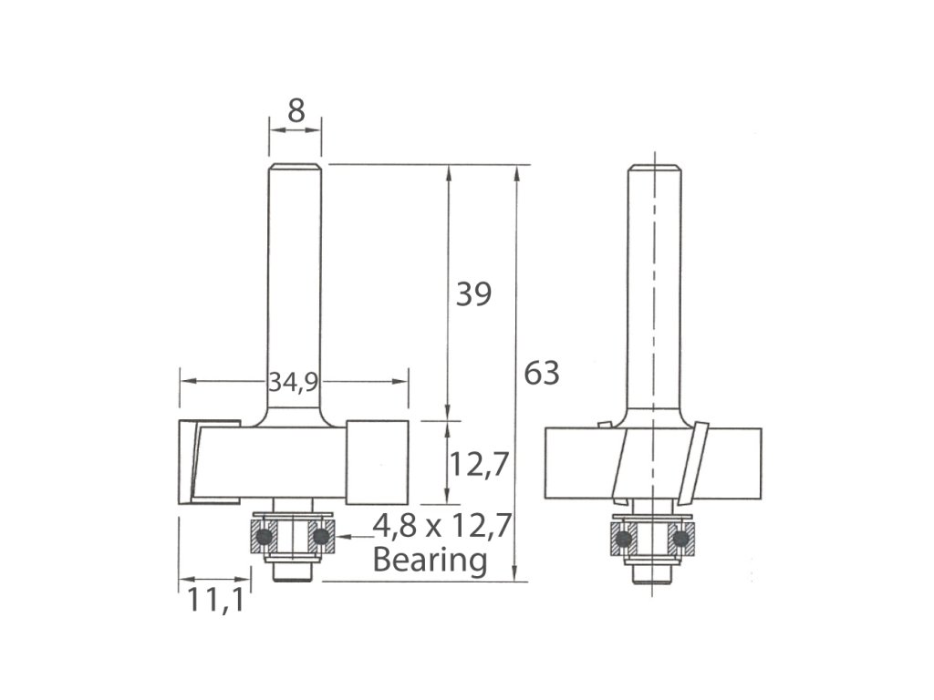 Falcovací fréza M135 se dvěma šikmými zuby z tvrdokovu je určená pro frézování podél šablony nebo hrany materiálu, například pro vsazovaná dvířka a zásuvková čela, polodrážkové spoje a spoje na pero a drážku. Lze použít pouze v ručních frézkách.