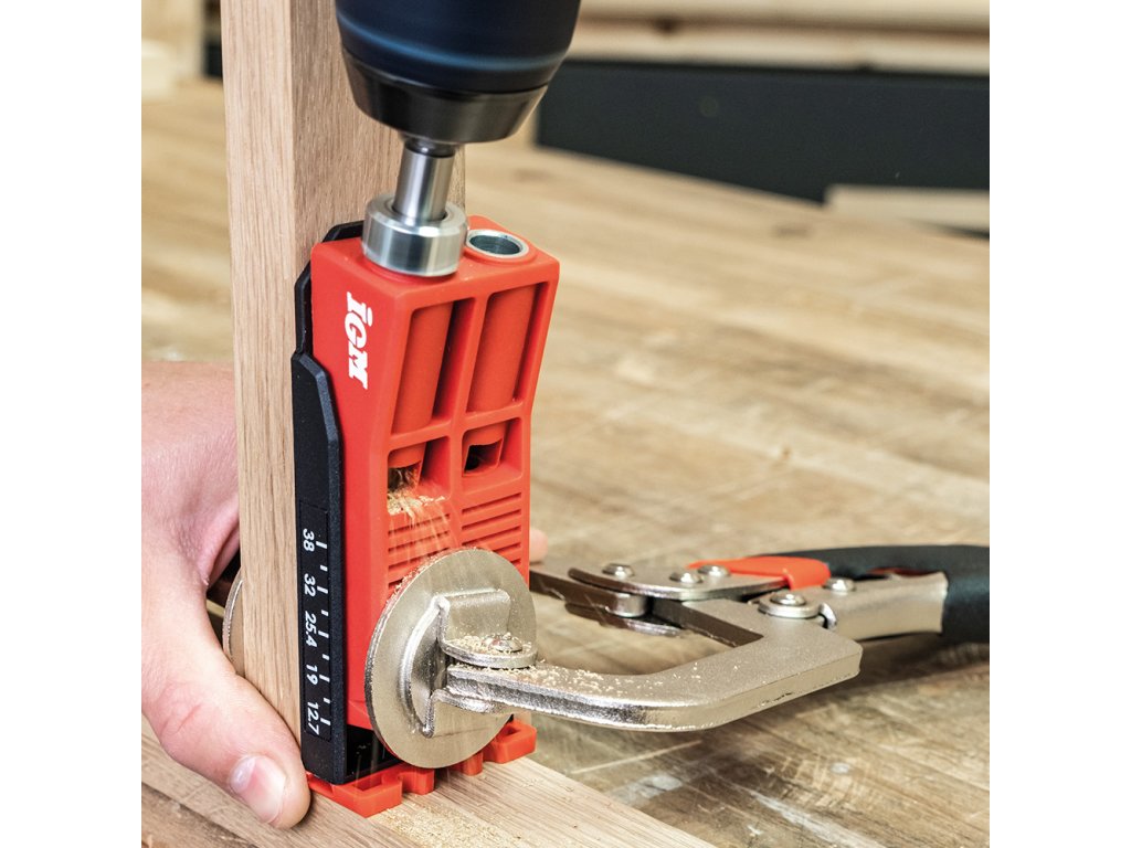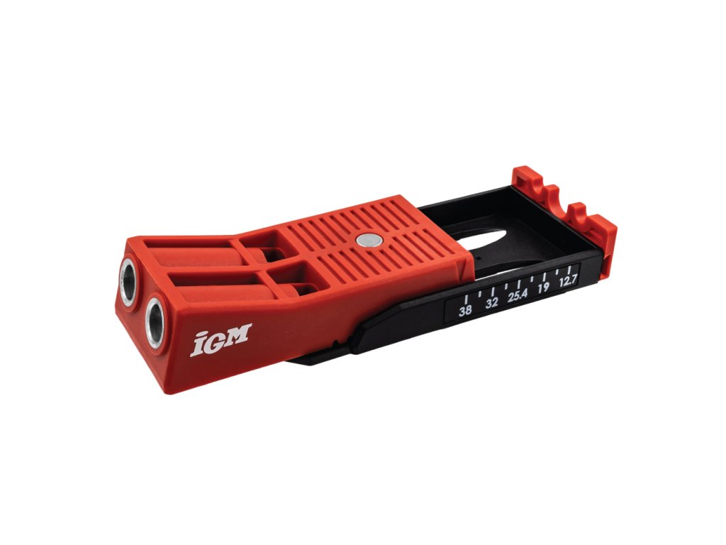 Svrtávací přípravek IGM pomůže vytvořit pevný spoj dřevěných dílců, například při montáži skříněk nebo jiného nábytku. Přípravek slouží k vrtání otvorů pro skryté šroubované spoje, s použitím vrtačky je vyvrtáte snadno a rychle. Vrtací pouzdro z tvrzené oceli vede HSS vrták o průměru 9,5 mm do materiálu o tloušťce 12 – 40 mm. Díky dvěma pouzdrům můžete vytvořit ještě pevnější spoj bez zbytečného přesouvání. Pomocí stupnice ze spodu přípravku si snadno nastavíte doraz, stačí jen změřit tloušťku materiálu. Vrtací pouzdro pak posunete dle naměřené tloušťky. Pouzdro drží pevně na místě díky magnetu a zářezům v těle přípravku. Čtyřhranným bitem Robertson č. 2 zašroubujete do vyvrtaného otvoru Pocket Hole vruty. Součástí sady je pět velikostí vrutů po 10 kusech. Otočnou zarážku využijete při vrtání o hranu dílce nebo při zpevňování již spojeného materiálu, například pokosového spoje. Abyste přípravek při fixaci na dílec nemuseli složitě přidržovat, je plochá horní část vybavena magnetem, ke kterému se přichytí čelist Pocket Hole svěrky. Přípravek s příslušenstvím je uložený v přenosném kufříku s návodem.