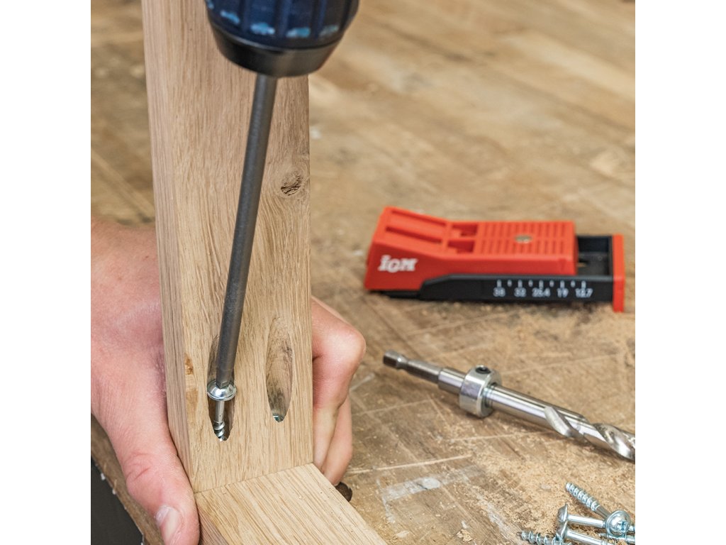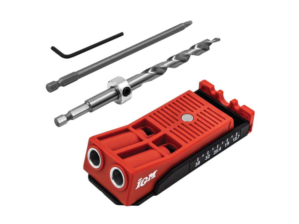 Svrtávací přípravek IGM pomůže vytvořit pevný spoj dřevěných dílců, například při montáži skříněk nebo jiného nábytku. Přípravek slouží k vrtání otvorů pro skryté šroubované spoje, s použitím vrtačky je vyvrtáte snadno a rychle. Vrtací pouzdro z tvrzené oceli vede HSS vrták o průměru 9,5 mm do materiálu o tloušťce 12 – 40 mm. Díky dvěma pouzdrům můžete vytvořit ještě pevnější spoj bez zbytečného přesouvání. Pomocí stupnice ze spodu přípravku si snadno nastavíte doraz, stačí jen změřit tloušťku materiálu. Vrtací pouzdro pak posunete dle naměřené tloušťky. Pouzdro drží pevně na místě díky magnetu a zářezům v těle přípravku. Čtyřhranným bitem Robertson č. 2 zašroubujete do vyvrtaného otvoru Pocket Hole vruty. Otočnou zarážku využijete při vrtání o hranu dílce nebo při zpevňování již spojeného materiálu, například pokosového spoje. Abyste přípravek při fixaci na dílec nemuseli složitě přidržovat, je plochá horní část vybavena magnetem, ke kterému se přichytí čelist Pocket Hole svěrky.