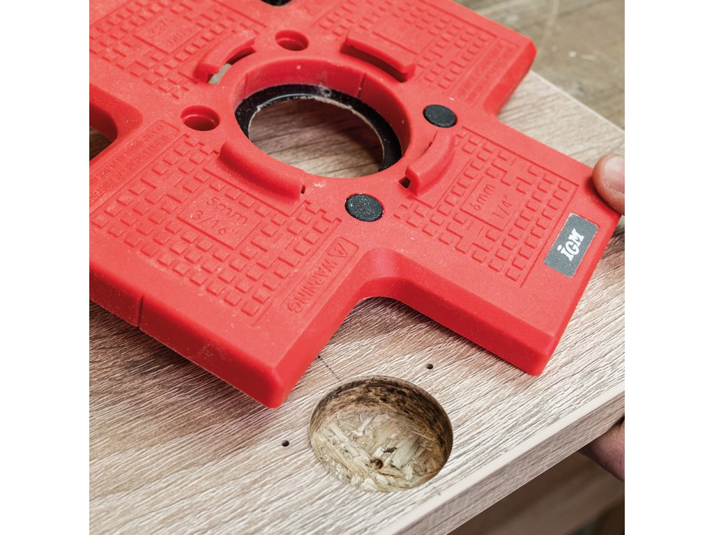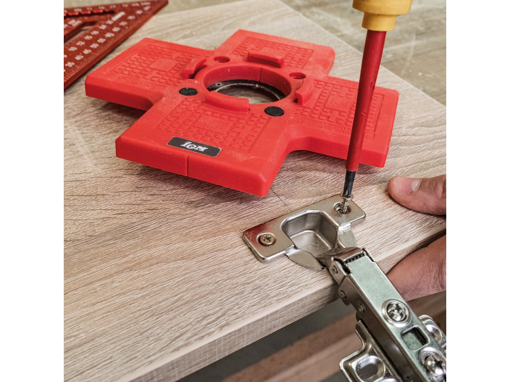 Šablona pro vrtání misek pantů zaručuje rychlou a přesnou instalaci 35mm pantů bez zdlouhavého měření. Nastavitelné odsazení 3–6 mm od hrany dvířek. Magnetická šablona pro přesné vrtání otvorů pro vruty usnadní montáž pantů značky Blum, Strong i Hettich. Ideální pro nábytkáře.