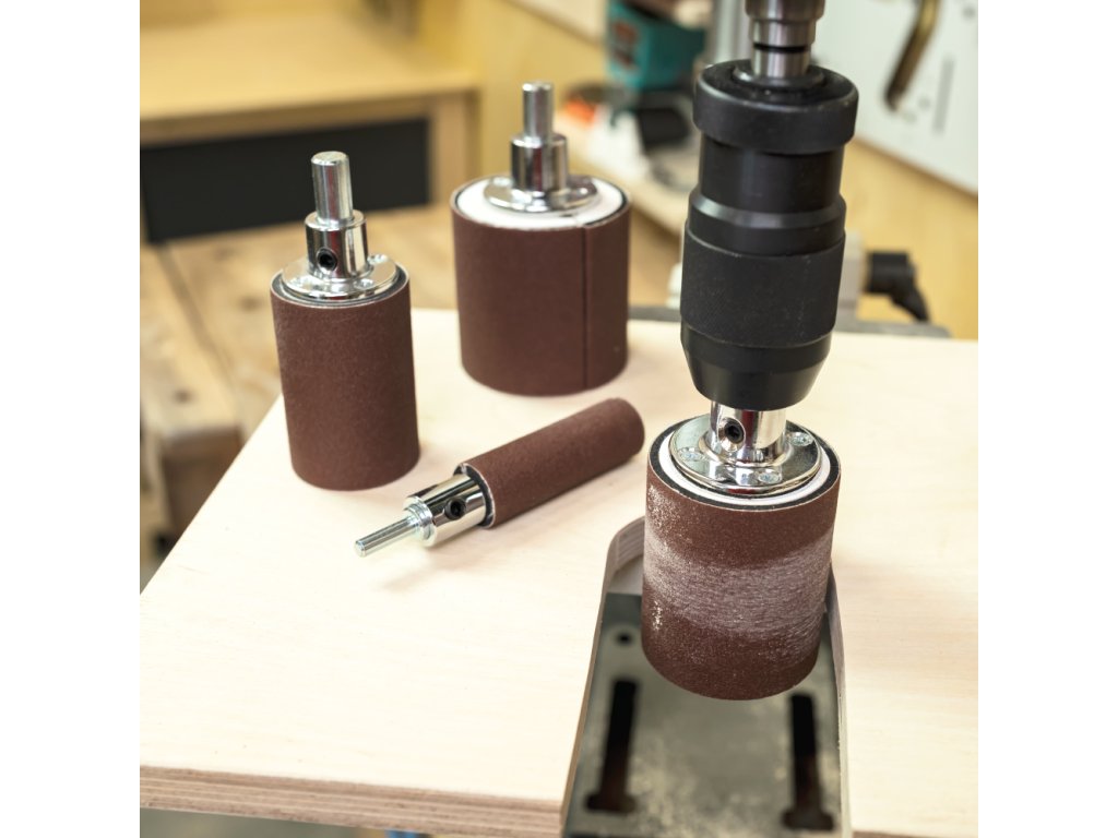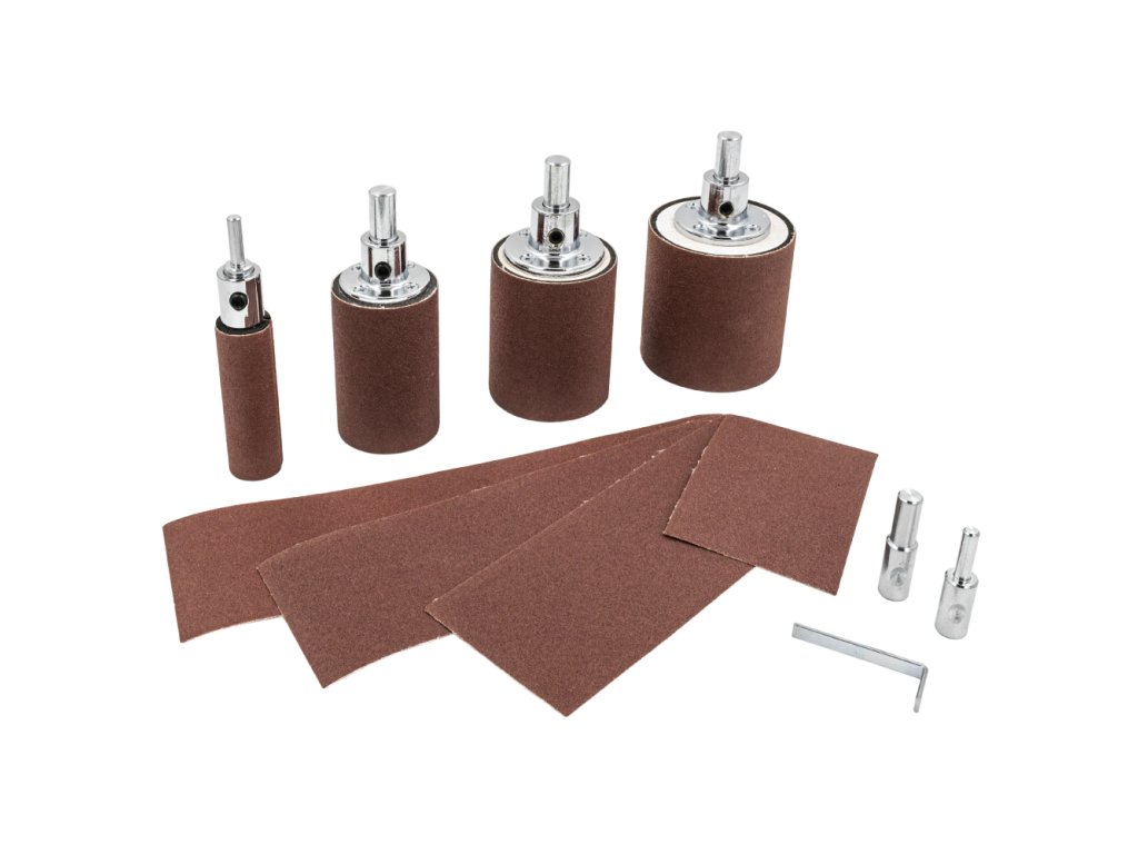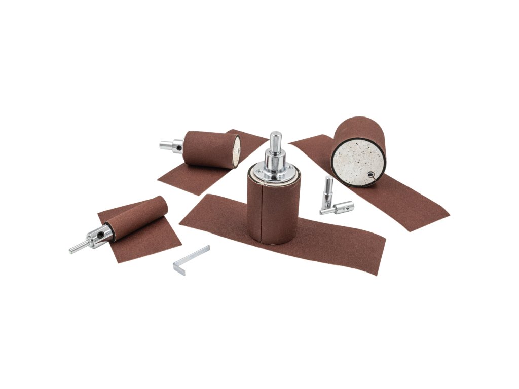 Sada 4 kusů brusných válečků je určena pro snadné a rychlé dosažení dokonale hladkých povrchů u všech zakřivených a kulatých dílců. Brusné válečky mají praktický upínací systém pro snadnou výměnu pásu. Doporučujeme použít pouze brusné plátno, u papíru může docházet k častějšímu roztržení. Na každý brusný váleček může být použit trn podle velikosti sklíčidla Vaší vrtačky. S brusnými válečky lze pracovat ve stojanové vrtačce. Menší průměry 25mm a 53mm můžete použít i v ruční vrtačce. Doporučené otáčky 1000 - 1500 ot./min dle průměru válečku a materiálu. Malý průměr -> vyšší otáčky, větší průměr -> nižší otáčky.