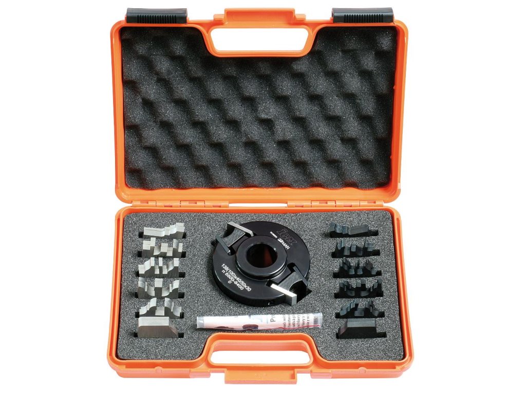 Velmi oblíbená sada univerzální frézovací hlavy a profilů pro výrobu dvířek a výplní z měkkého dřeva. Tělo nástroje je vyrobeno z kvalitní oceli nebo z tvrzené hliníkové slitiny (ALU) s vysokou pevností. Euro upínací systém zajišťuje perfektní a přesné upnutí nožů 40 x 4mm a 50 x 4mm kód F026 a omezovačů F027. Určeno pro ruční posuv MAN.