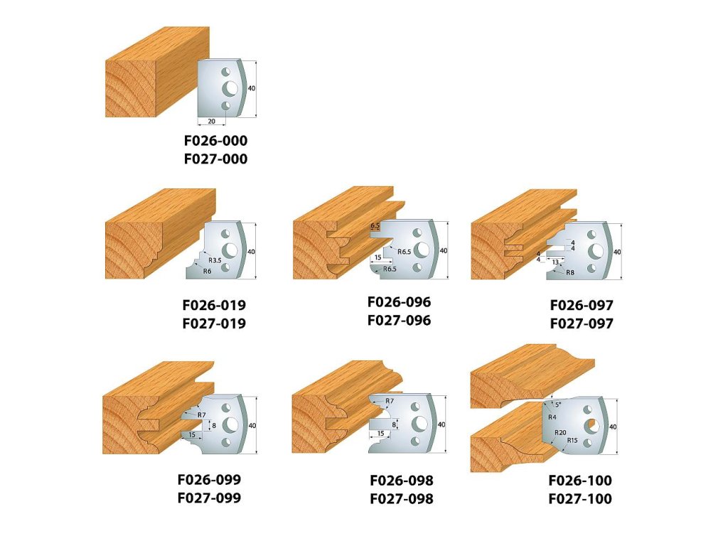 Velmi oblíbená sada univerzální frézovací hlavy a profilů pro výrobu dvířek a výplní z měkkého dřeva. Tělo nástroje je vyrobeno z kvalitní oceli nebo z tvrzené hliníkové slitiny (ALU) s vysokou pevností. Euro upínací systém zajišťuje perfektní a přesné upnutí nožů 40 x 4mm a 50 x 4mm kód F026 a omezovačů F027. Určeno pro ruční posuv MAN.